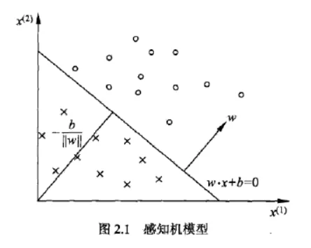 如图所示,圆和叉分别是特征空间中的点,从图中可以看出他们是线性可分的,线性方程$w \cdot x+b=0$为一个超平面,w是超平面的法向量,b是超平面的截距,超平面将空间中的点分为正负两类