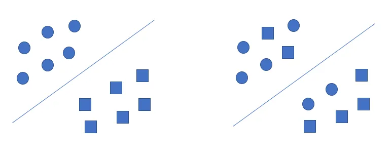 如下图所示,左边的数据集可以找到一个超平面将其分开,所以是线性可分的;右边数据集找不到一个超平面将其分开,所以是线性不可分的