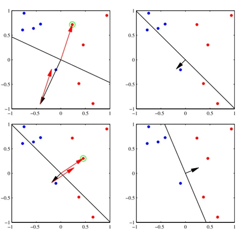 直观解释:如下图所示,当有一个实例点被误分类时,即位于超平面的错误一侧时,则调整$w, b$的值,使超平面向该误分类点的一侧移动,以减少该误分类点与超平面的距离,直到超平面越过该误分类点使其被正确分类,如下图所示