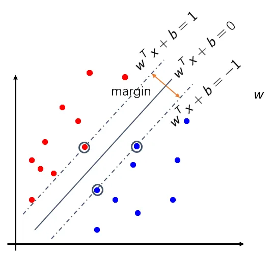 支持向量(support vector)就是在分类过程中支持margin的那些点,他们到超平面的距离相等,下图中用黑色圈圈出的点就是support vector