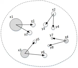 Monge形式的最优传输问题求解困难且具有一定的病态性,但是由于18世纪各种数学定理发展不够成熟,最优传输问题一直没有得到很好的解决。直到1942年Kantorovich成功地解决了此问题,如图所示,Kantorovich形式的最优传输可以描述为:不将每一堆土直接填充到坑中,而是将一堆土分为若干部分然后进行填充。其数学表述如下: