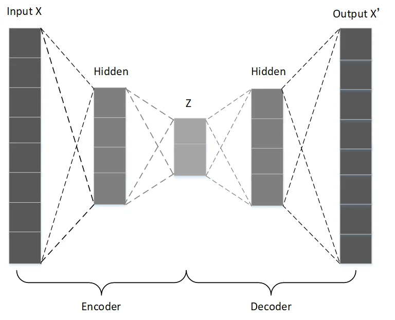 当输出$X’$无限接近于输入$X$,即$X’\approx X$时,就得到了自编码器模型