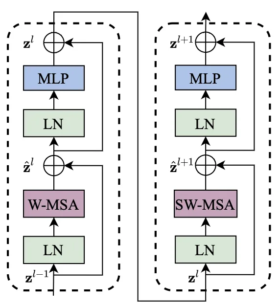 包含两个主要模块,SW-MSA 和 MLP