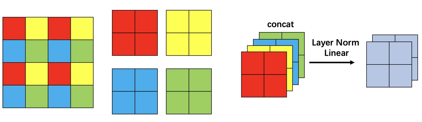 在每个 Stage 结束的阶段都有一个 Patch Merging 的过程,这个过程会让输入进行降维,同时通道变为原来的二倍,用一个图来清晰的展示此过程,图示如下