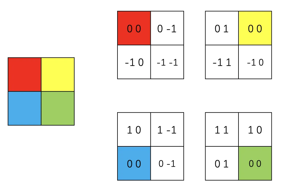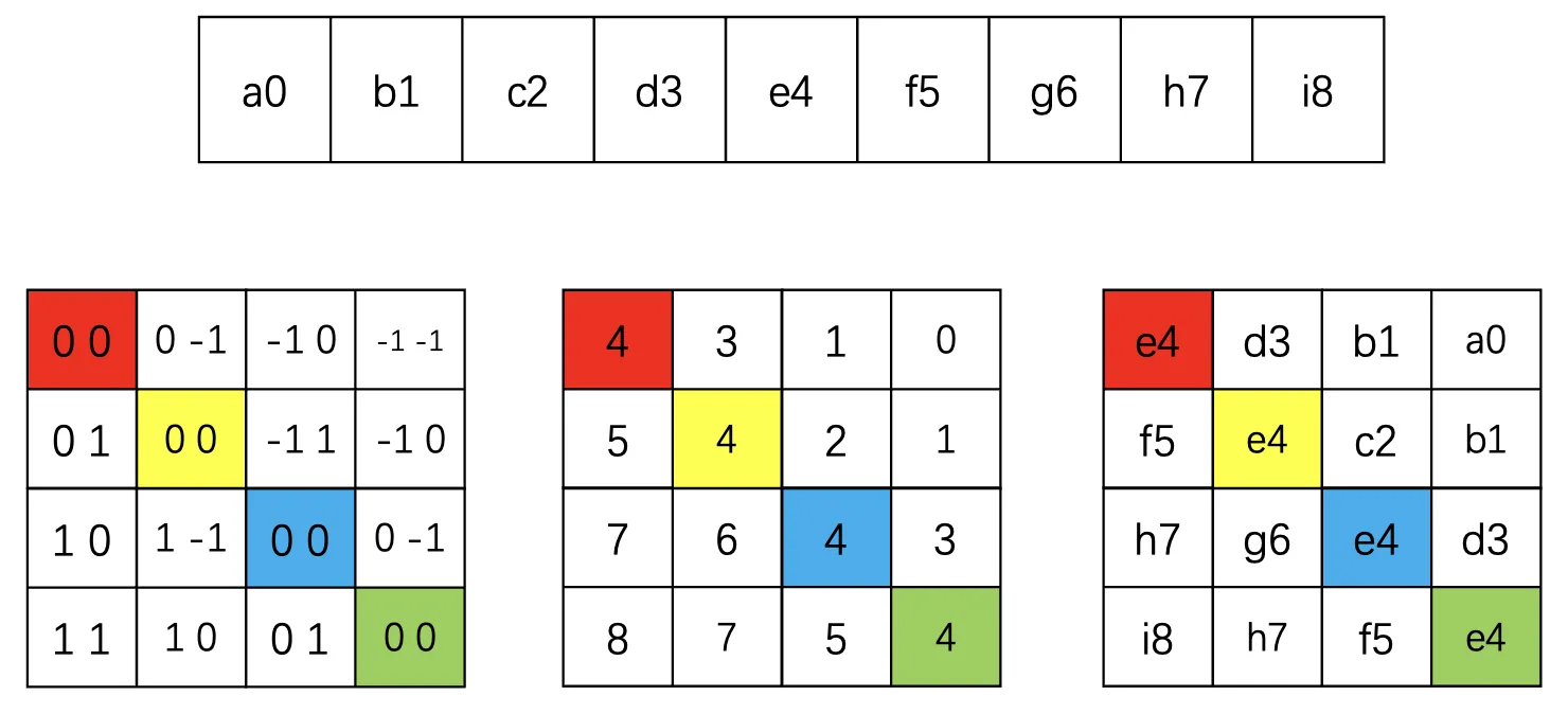 这里的相对位置偏置这样理解,在窗口中任意选定一个坐标,遵循 左+右-上+下- 的原则,可以发现当我们将左上角的值为 (0, 0) 时,他右边的位置为 (0, -1) 减了 1,下面的位置为 (-1, 0) 也减了 1,同理将其他位置设为 (0, 0) 时,结果分别如图所示