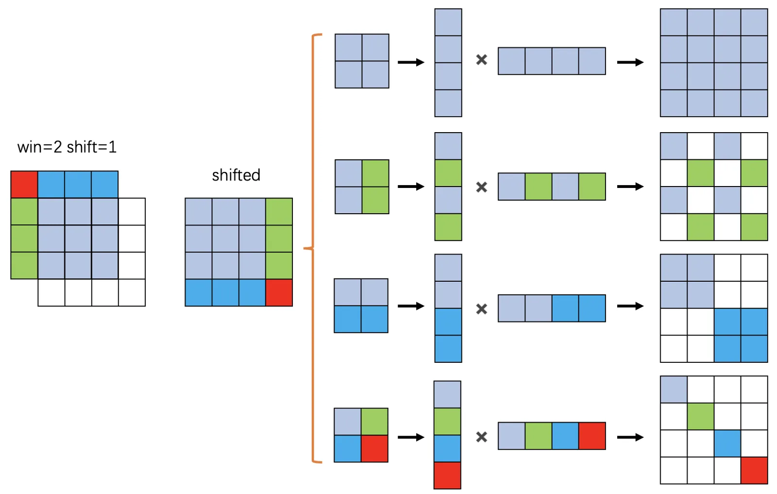 与 W-MSA 不同的地方在于这个模块存在滑动,所以叫做 shifted window,滑动的距离为 win_size//2 在这里也就是 7//2=3,这里用 image(4, 4) win(2, 2) shift=1 来图示他的 shift 以及 mask 机制