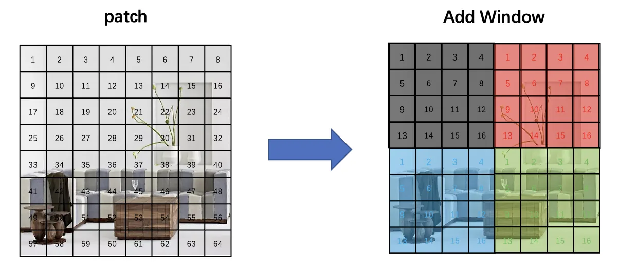 ==为什么要进行 window partition?在 Vision Transformer 中,我们将图片分成了一个个 patch(也就是左边的图),在进行 MSA 时,任何一个 patch 都要与其他所有的 patch 都进行 attention,当 patch 的大小固定时,计算量与图片的大小成平方增长。Swin Transformer 中采用了 W-MSA,也就是 window 的形式,不同的 window 包含了相同数量的 patch,只对 window 内部进行 MSA,当图片大小增大时,计算量仅仅是呈线性增加(只增加了图片多余部分的计算量,比如之前是 224 的图像,现在是 256 的图像,只多了 256-224=32 像素的计算部分),下面详细介绍 window attention 部分==