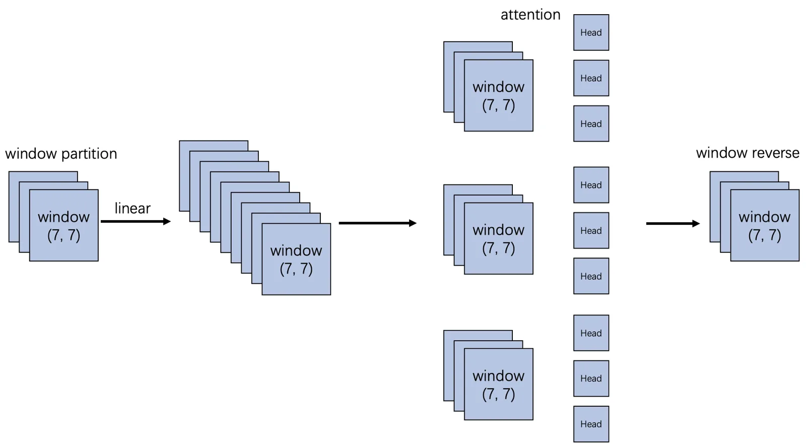 所有 attention 步骤执行完之后就可以回到 attention 之前的维度(64B, 7, 7, 96),然后我们经过一个 window reverse 操作就可以回到 window partition 之前的状态了,即(B, 56, 56, 96)。window reverse 就是 window partition 的逆过程