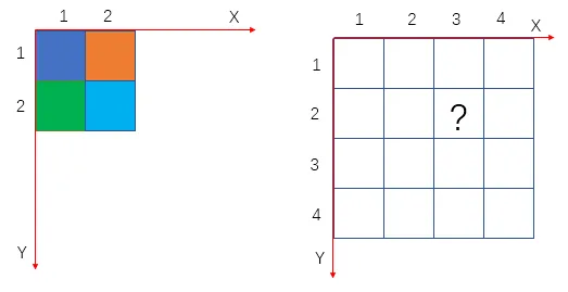 举个例子,假设放大倍数为2,那么$src=des\times 0.5$,对于下图,坐标(3,2)处的颜色应为原来坐标系$(3\times 0.5, 2\times 0.5)=(1.5, 1)$也就是(2, 1)对应橙色