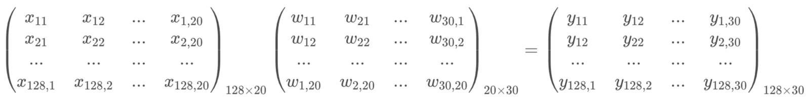 从下图可以看出 b=128,我们先不管这个参数,他的每一个数据 m=20,n=30,b 中的每一个数据都需要计算 m 次乘法,计算完之后如果有 bias 需要额外计算 m 次加法,输出维度为 n,所以一共需要计算 mn 次乘法和 mn 次加法,即 Flops:$mn$,算上 batch 为$bmn$