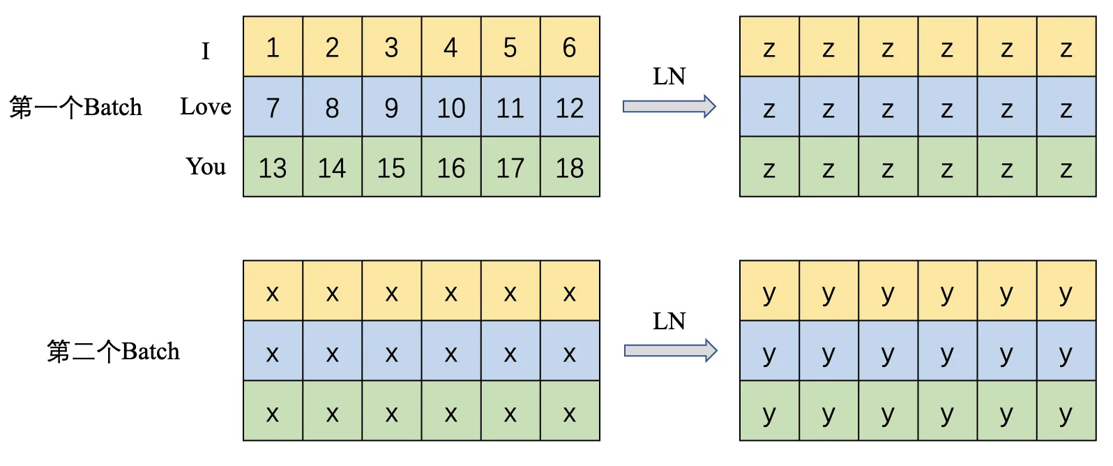 在 Transformer 中,给定输入 tensor[seq_length, batch_size, d_model],其中 seq_length 为序列长度,batch_size 为 batch 大小,d_model 为 embedding 的维度,LayerNorm 按指定维度(通常是最后一个维度)归一化,如下所示,我们有多个 batch,其中第一个 batch 的序列长度为 3,包括“I, Love, You”,他们的词向量维度均为 6,在 LayerNorm 的时候,分别对“I”,“Love”,“You”向量进行归一化,即相同颜色的数字