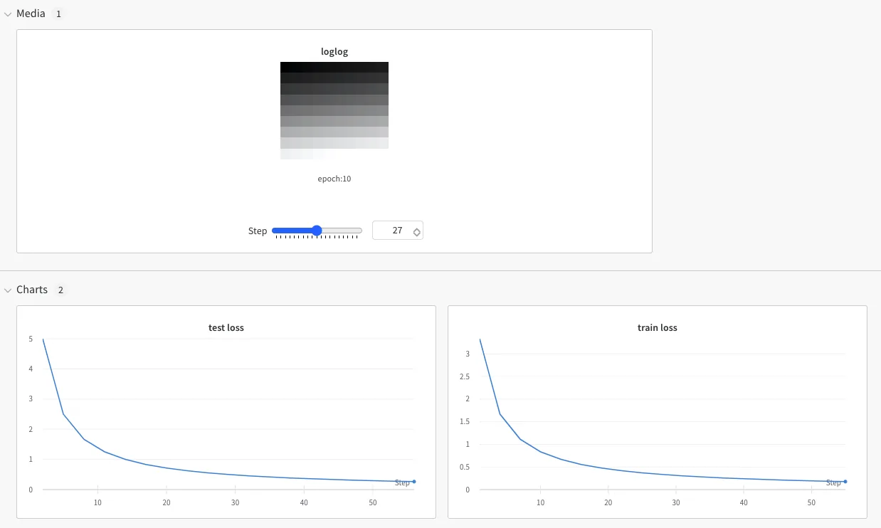 先直接给出代码看效果,我们在记录图片的同时运行了 wandb.log 记录 loss,当我们运行到 epoch=10 时,我们的 step 到了 27(如下图),图片的索引(即 step)没法修改为 epoch,所以我们在存储图片的时候直接修改 caption 即可知道是哪个 epoch 的图片了