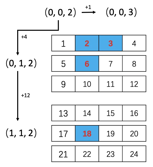 stride 代表着多维索引的步长,每一步都代表内存上的偏移量+1,对于(2, 3, 4)维度的 tensor:stride+1 代表着(dim2)+1,stride+4 代表其余 dim 不变,(dim1)+1,stride+12 代表其余 dim 不变,(dim0)+1,如下图所示
