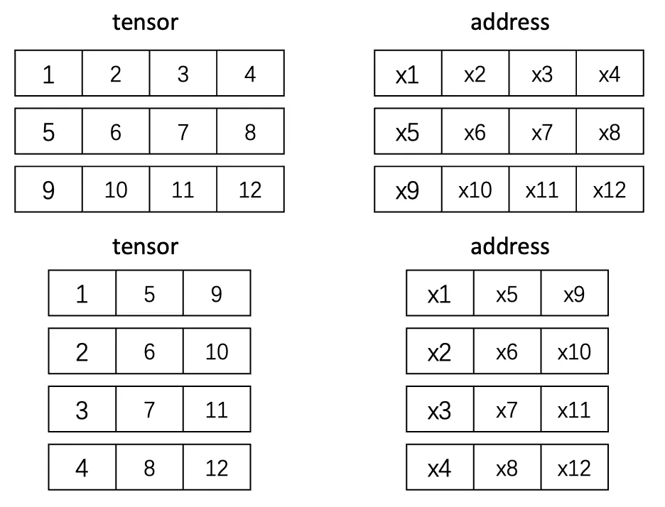 注意:不论怎么变化每个元素对应的地址是不变的,比如 11 对应的地址为 x11,transpose 之后 11 依然对应 x11,那么变化的是什么呢?还记得 tensor 分为信息区和存储区吗,存储区是不变化的,变化的是信息区的 shape,stride 等信息,有时间以后做介绍~
