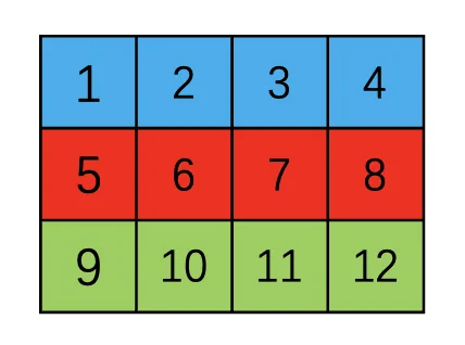简单理解就是tensor 在内存地址中的存储顺序与实际的一维索引顺序不一致时使用,如下所示,对上面的 tensor 进行一维索引,结果为[1, 2, 3, 4, 5, 6, 7, 8, 9, 10, 11, 12],对原 tensor 运用 transpose 进行转置,在对其进行一维索引,结果为[1, 5, 9, 2, 6, 10, 3, 7, 11, 4, 8, 12],这时索引顺序发生了变化,所以需要用 contiguous