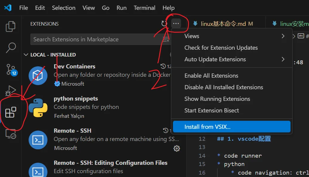 然后点击 download enxtension,此时会下载一个 vsix 文件,然后如下图所示手动安装即可