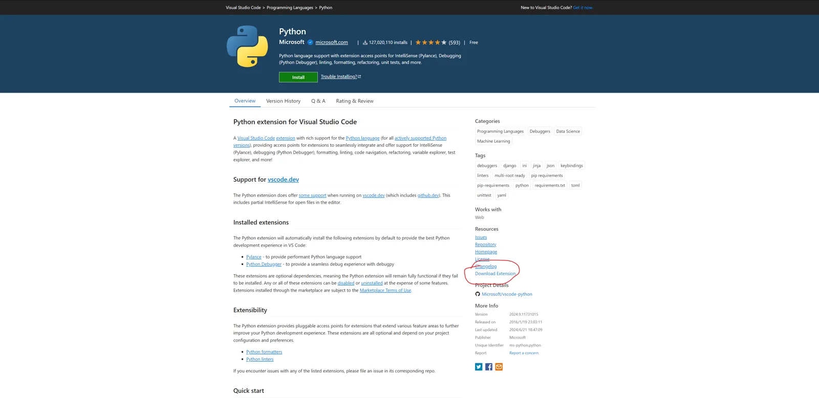 进入到vscode extension,然后搜索自己想安装的插件,如下所示,这里我搜索 python