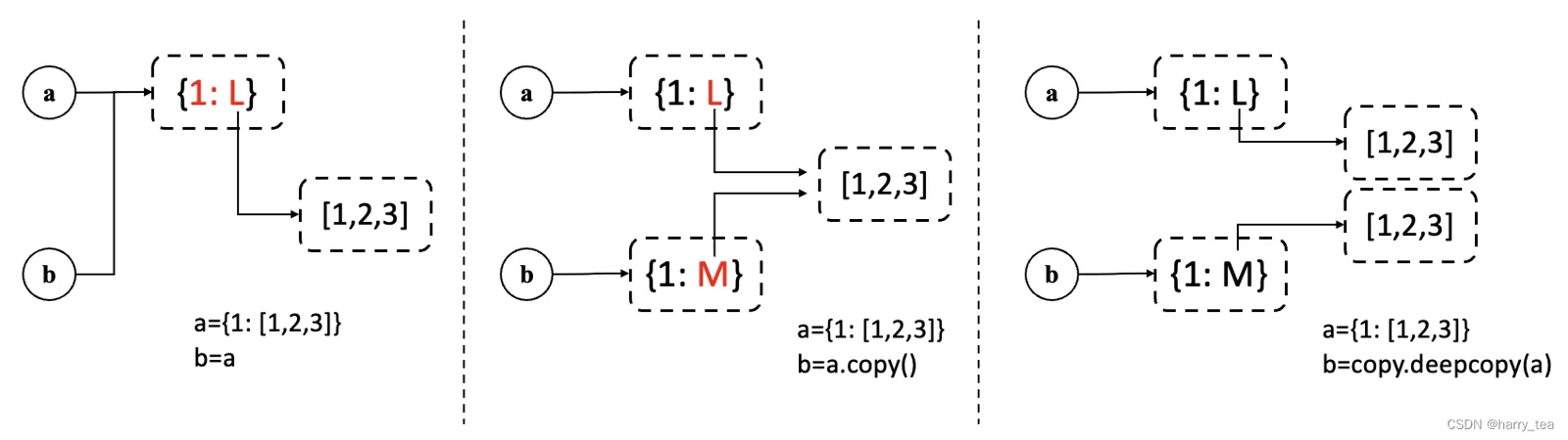 其中红色部分代表两个变量的共有部分,即修改一个另一个也随之变化;黑色部分是独立部分