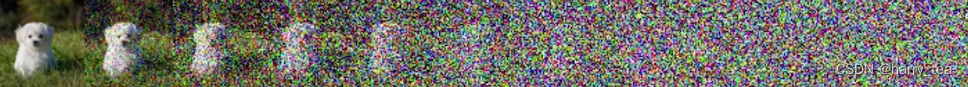 下图展示了前向加噪的过程中图片的变化,从左到右为$x_{0}, x_{1}, …, x_{T}$