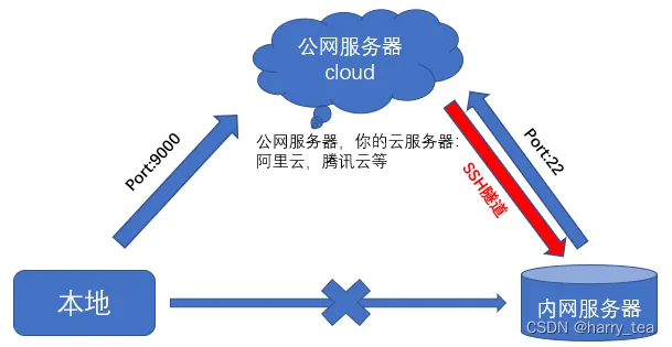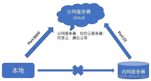 现有:内网小服务器 A,公网服务器 B 以及家里的电脑 C,其中本地无法连接内网,但是本地和内网都可以连接公网