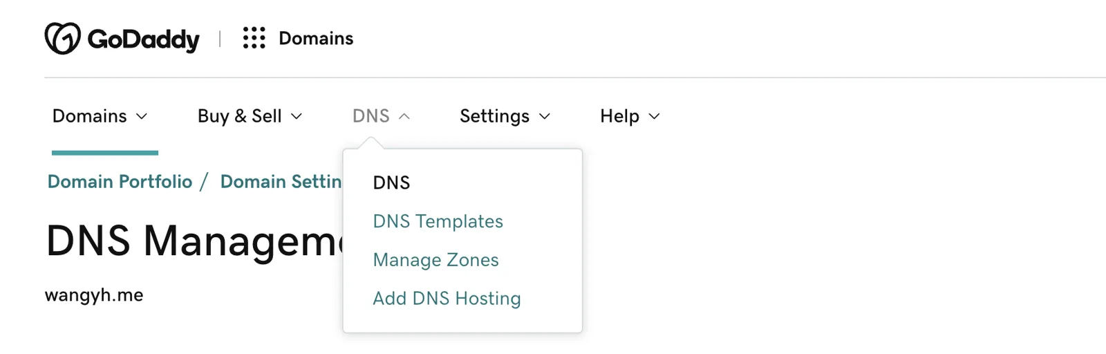 如图我们进入到域名管理界面,找到 DNS,点击 Manage Zones,