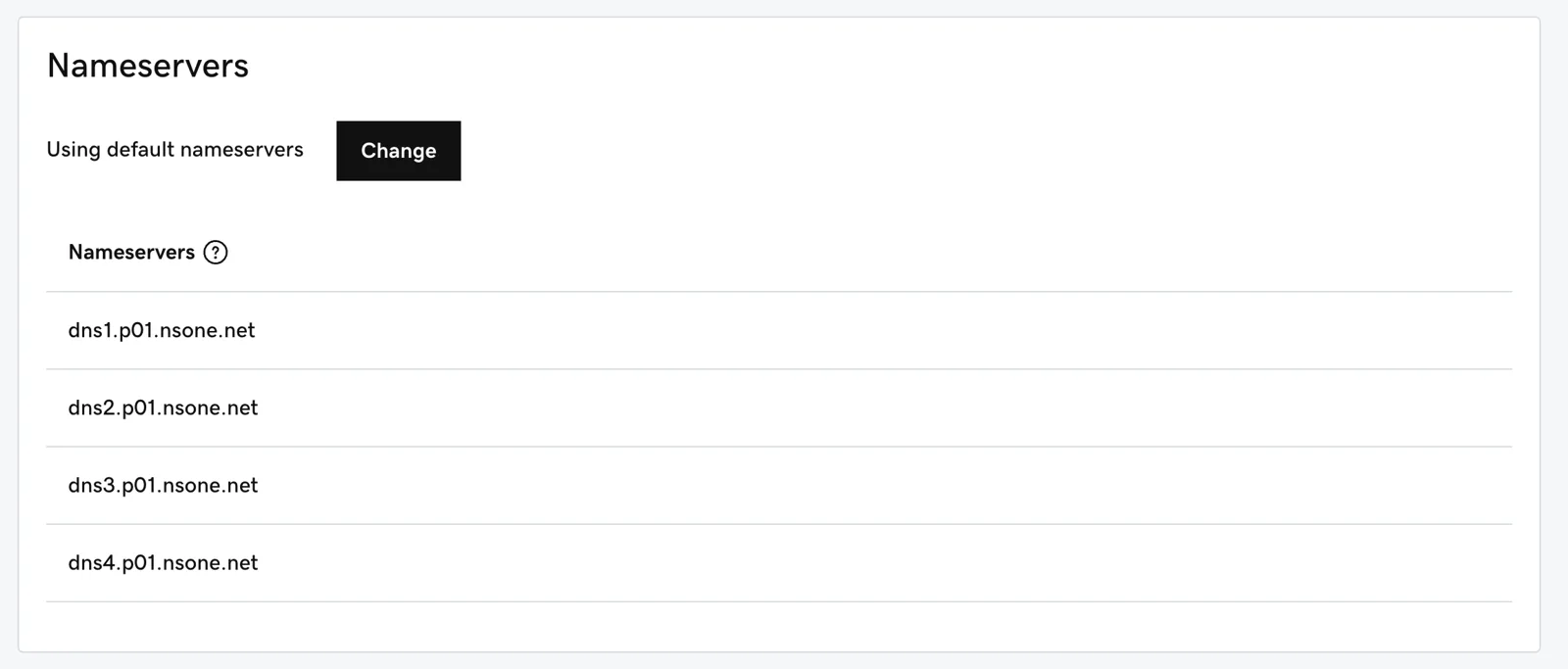 在没解析之前,是没有那个绿色对勾的,是一个 Awaiting DNS 设置之类的东西,此时点击它,会提示如下四个域名服务器,我们之后需要在 GoDaddy 中用此域名服务器解析我们的域名