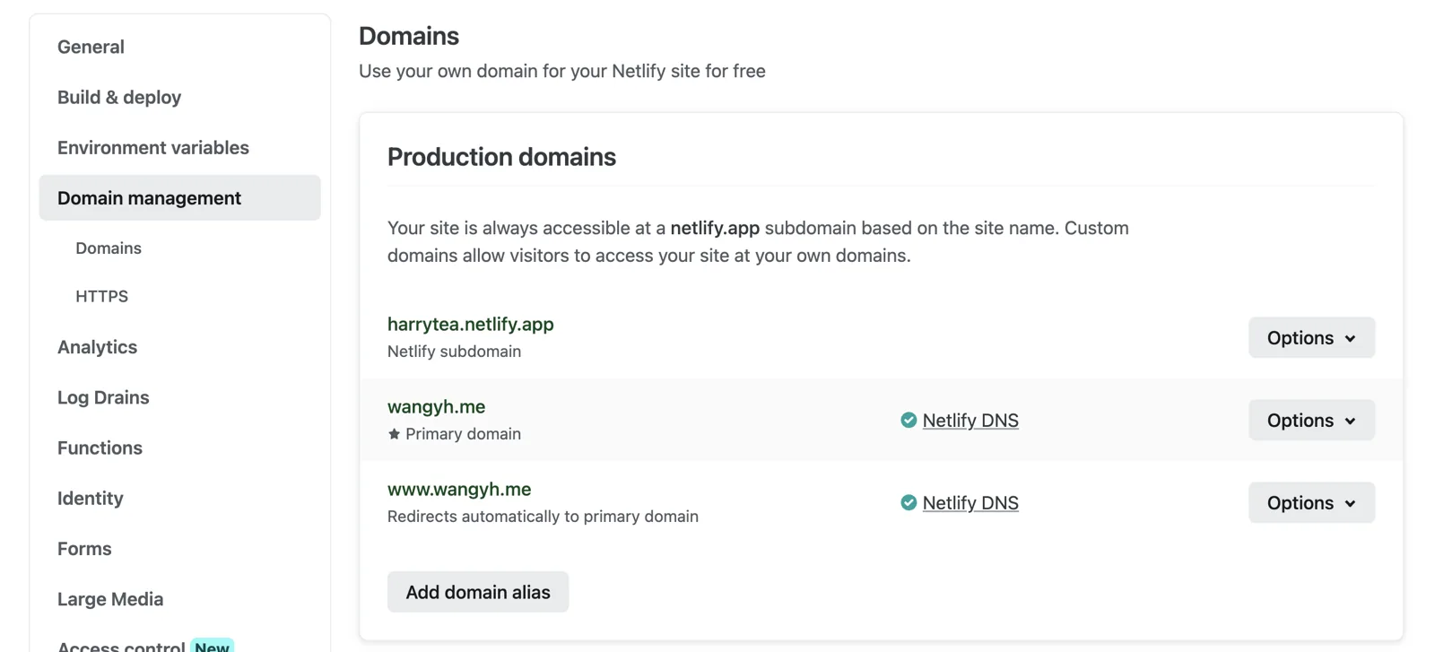 此时往下拉,可以看到 Add domain alias 按钮,这里我已经添加了,按照步骤添加自己的域名即可,添加完之后需要用 netlify 提供的域名服务器来解析域名
