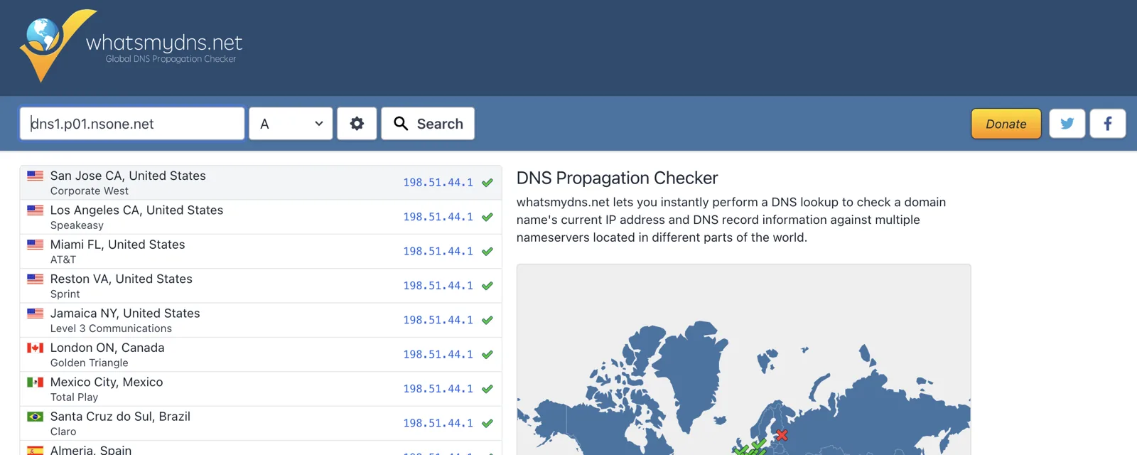 在某些情况下,GoDaddy 可能会提示为每个域名服务器指定一个 IP 地址。要查找域名服务器的 IP 地址,可以使用What’s My DNS之类的工具来识别域名服务器域的 A 记录。