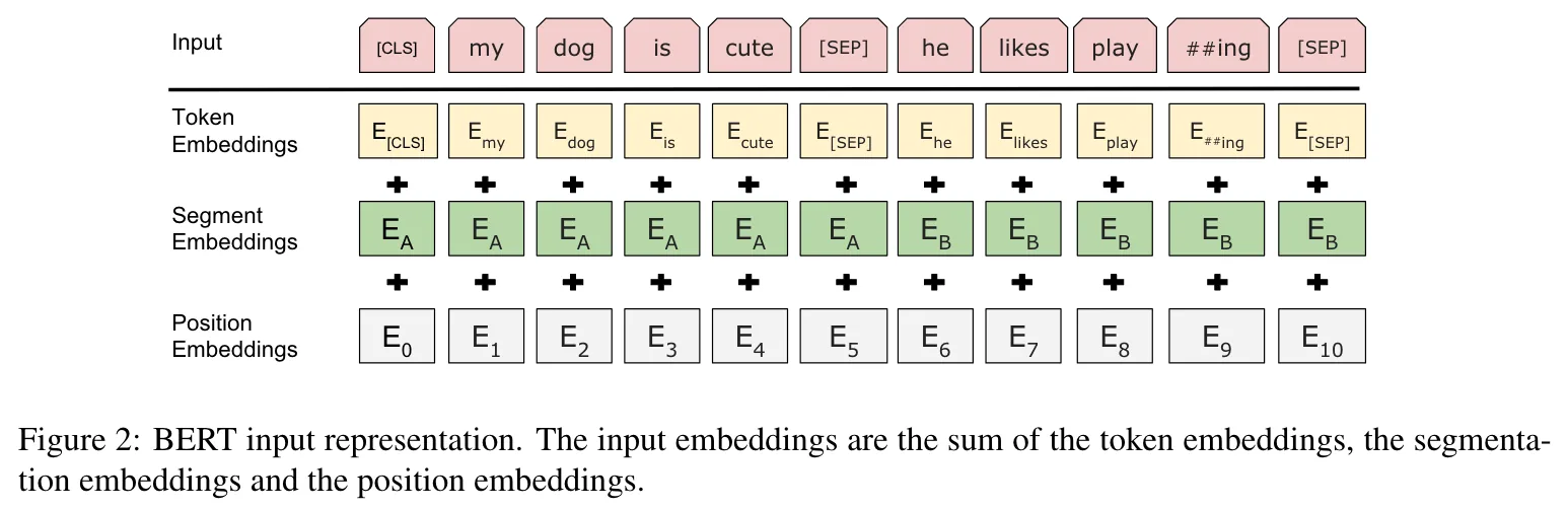 切词方法采用的是 WordPiece,一般来说使用空格进行切词,但是这样会有一些问题,比如如果某个词出现的频率很低,如果将他算为一个 tokend 的话,字典长度很大,可学习参数都在字典中了,于是就将他切成一个个小片段,每个小片段出现的频率很高,比如 wordpiece 这个单词,切成 word 和 piece 这两个小片段。切完词后,我们在每个 sequence 之前加入([CLS])用来分类,除此之外,在每个 sentence 最后加入([SEP])来区分不同的 sentence,如之前的 Pipeline 所示,整体为「cls, token, token, …, token, seq, token, token, …, token, seq」