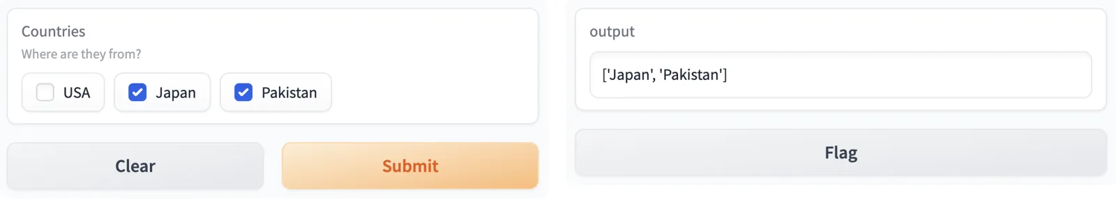 [gr.CheckboxGroup(["USA", "Japan", "Pakistan"], label="Countries", info="Where are they from?"),],
