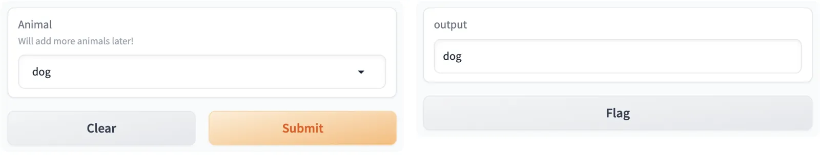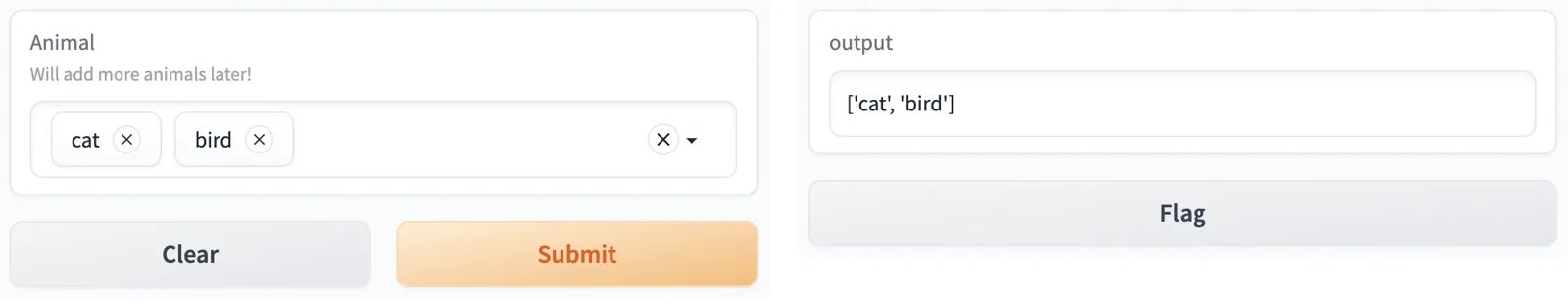 [gr.Dropdown(["cat", "dog", "bird"], multiselect=False, label="Animal", info="Will add more animals later!"),],