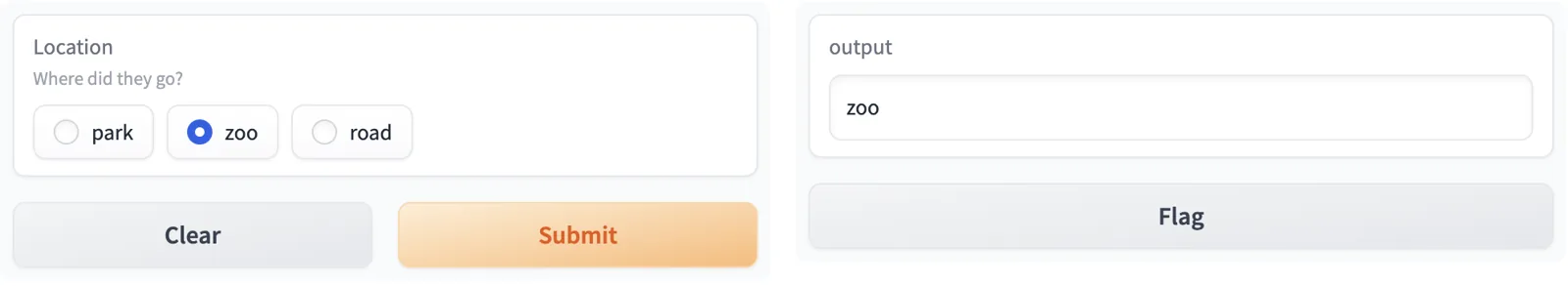 [gr.Radio(["park", "zoo", "road"], label="Location", info="Where did they go?"),],