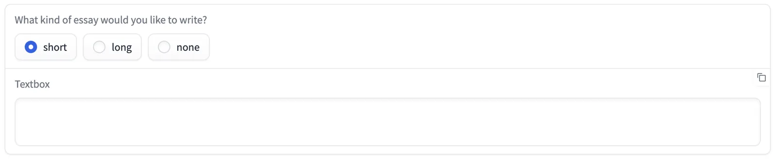 radio = gr.Radio(["short", "long", "none"], label="What kind of essay would you like to write?")