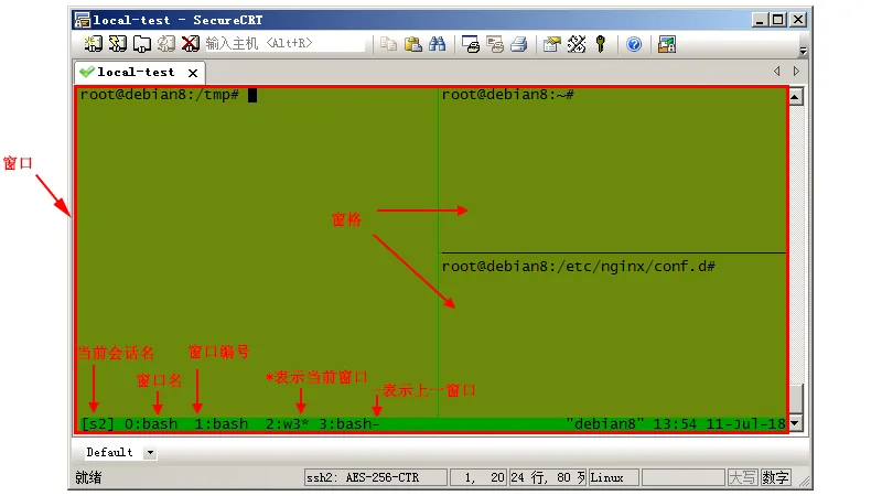 在明白如何创建 session 之后,我们要知道怎么在一个 session 中操作 window,操作 window 分为创建、切换以及删除。在 tmux 操作中,每当我们执行一个命令都需要先按一下 ctrl+b 进入命令状态