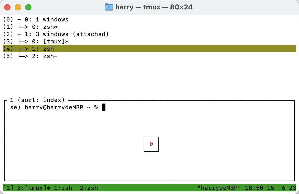 下面展示了切换 window 的状态,即 ctrl+b+w,从列表中可以看出有两个 session,session0 只有一个 window,session1 有 3 个 window