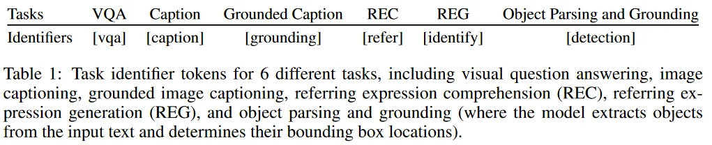 作者使用了 6 个与视觉相关的 token,与视觉无关的任务不使用 identifier token,这 6 个任务分别是:visual question answering, image caption, grounded image captioning, referring expression comprehension, referring expression generation, and phrase parsing and grounding