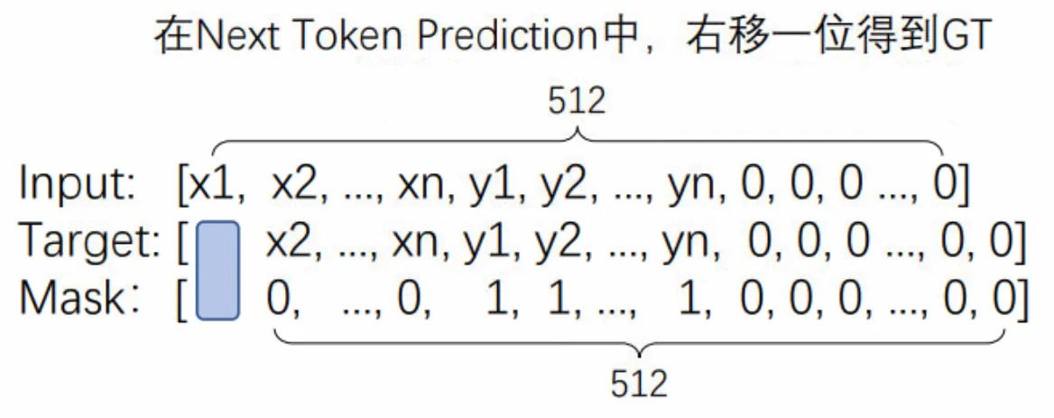 如下图所示,e2e 任务是给定一些独立词汇组成一个句子,input 中的 x 为独立词,y 为组成的句子,0 为填充,将所有的 token 填充到 512 个。对于 Target 由 next token prediction 策略,只需要将所有 token 向右移动一位即可,这样是 511 个 token,然后在后面补 0 即可。Mask 是一个标记,仅标记 y 所在位置。
