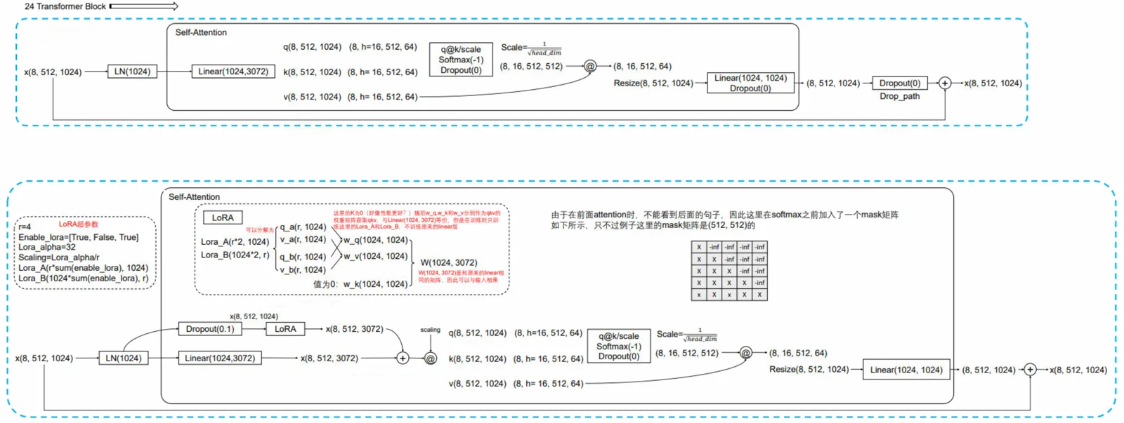 接下来是代码中最重要的部分,在 GPT-2 中,这里的模型有 24 个 transformer block,head=16,hidden=1024,其中这里绘制了两个图,其中上面的图是正常的 transformer 中的 attention 操作:LN-Attn,由于上面的部分非常熟悉了,这里就不做介绍了,只对下面的加入 lora 的部分进行介绍。