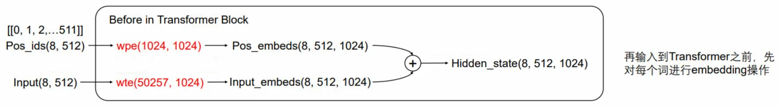 再输入到 transformer 中,我们首先对其进行向量化处理,如图所示,我们从词表中 wte(50257, 1024 找到每个 token 对应的词向量,同时从 wpe(1024, 1024) 中找到每个 token 对应的位置向量,然后将两个向量相加,得到最终的输入向量