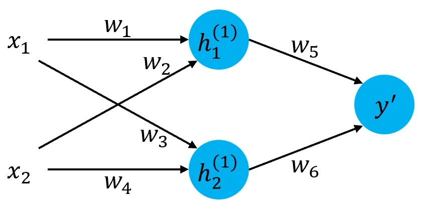 由$y^{’} = h_{1}^{(1)}w_{5} + h_{2}^{(1)}w_{6}$,得到