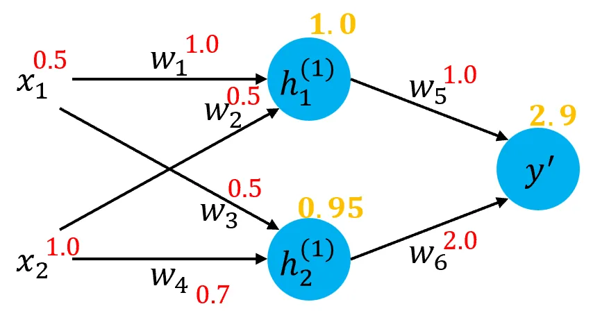 & y^{’} = h_{1}^{(1)}w_{5} + h_{2}^{(1)}w_{6} = 1.0\times 1.0 + 0.95\times 2.0 = 2.9