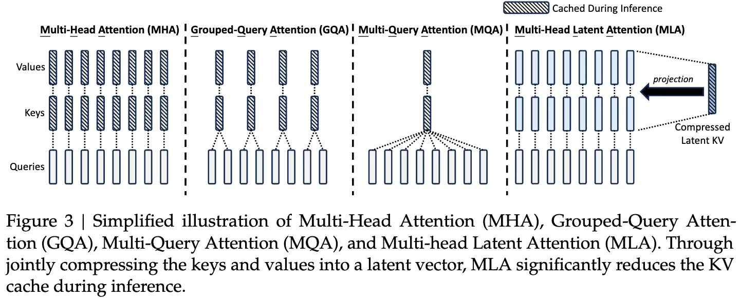 缓存内容 每 token 缓存 Key + Value(2 × nₕ × dₕ) 每 token 只缓存一个 latent 向量(d_c)
