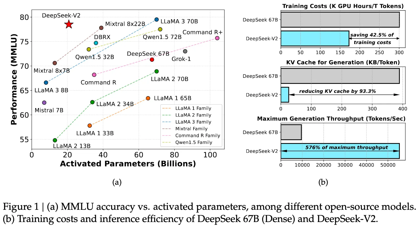 DeepSeek-V2 是 MoE(Mixture-of-Experts)稀疏激活模型,总参数量是 236B,但每次只用其中的一小部分(21B)来进行计算。