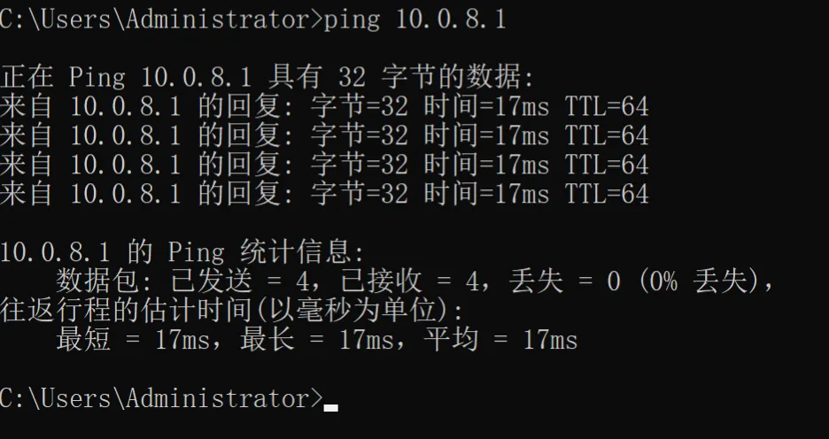• 使用 ping 10.0.8.1 测试基本连接