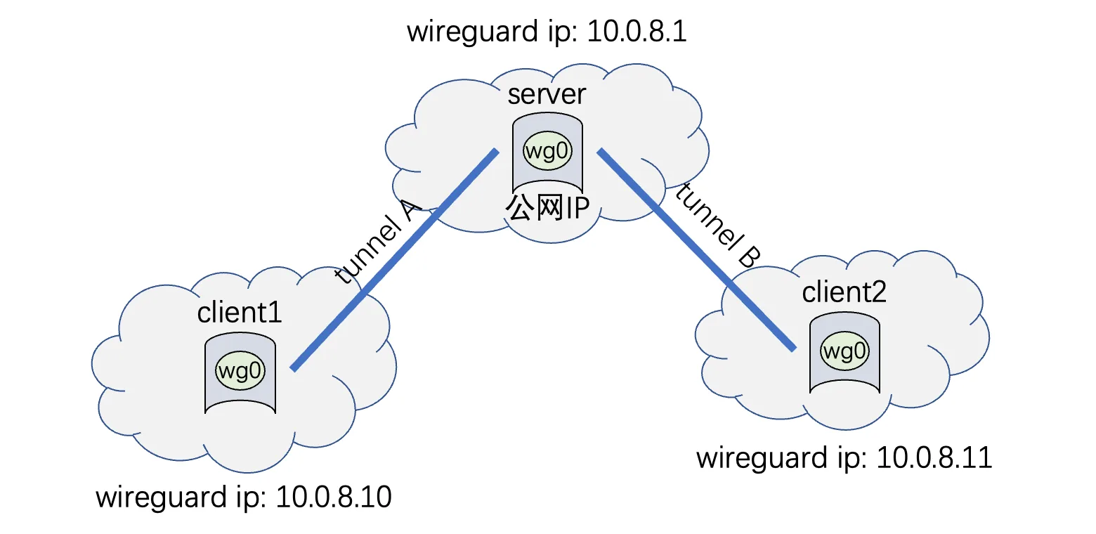 wireguard 可以用来进行组网,如上所示,我有一个带有公网 IP 的服务器 server,同时我还有两个客户端 client1 和 client2,通过在这三个设备上安装 wireguard,就可以让三个网络处在同一内网状态下