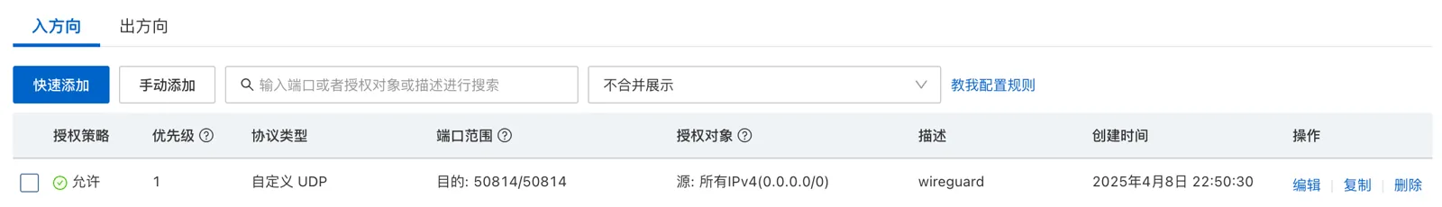 这里我们用的是 50814 端口,也可以随意指定,如果你的服务器是阿里云等厂商的,需要进入到服务器面板打开端口的 UDP 转发,因为 wireguard 是利用 UDP 转发流量的