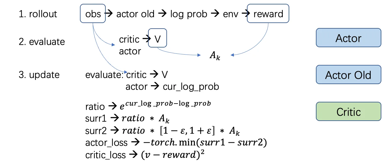 • 总损失:$L(\theta, \phi) = -L^{CLIP}(\theta) + c_1 L^{VF}(\phi) - c_2 S[\pi_\theta](s_t)$