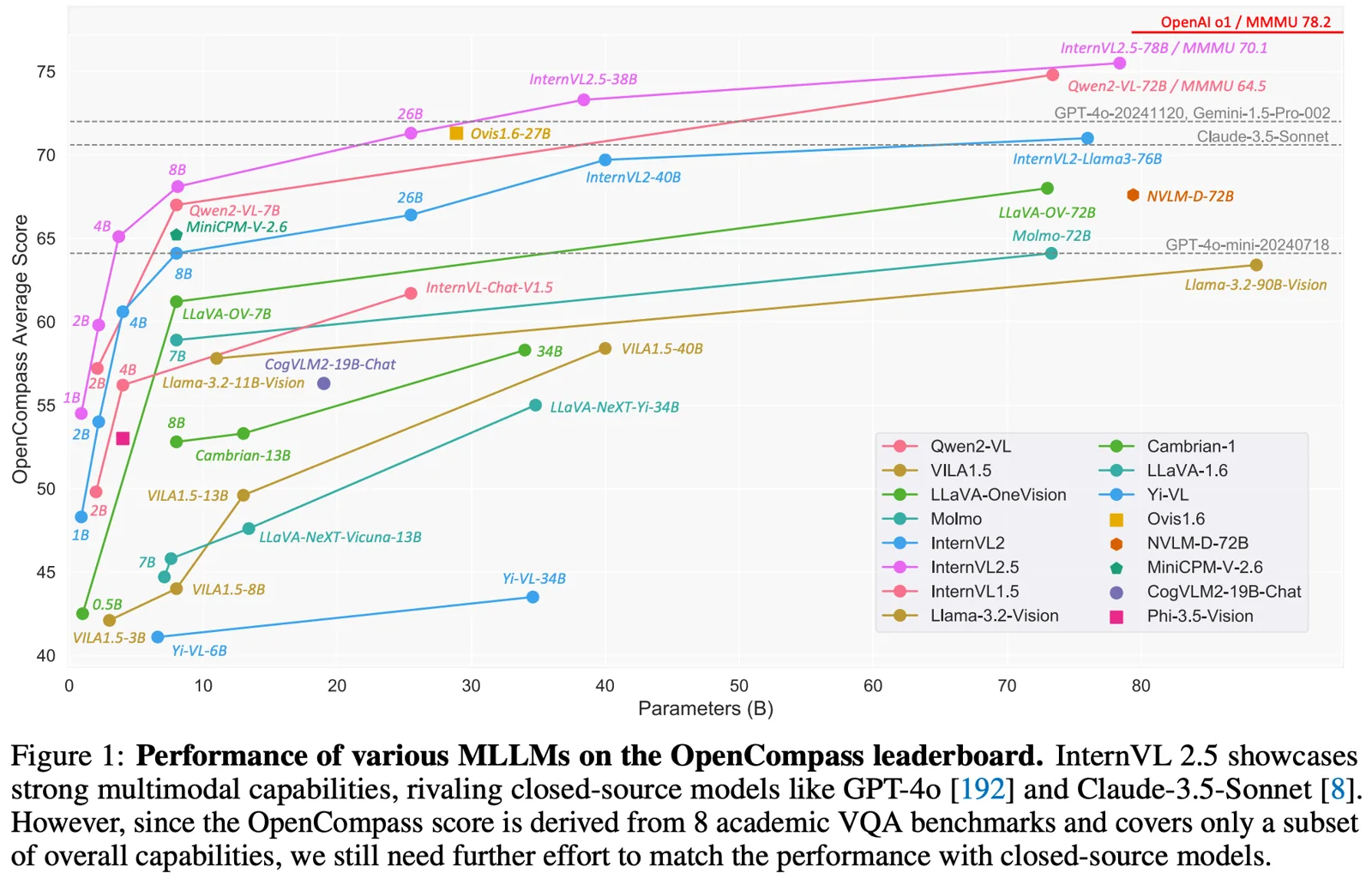 下面是作者在 introduction 部分的指标对比,InternVL-2.5 性能也是遥遥领先