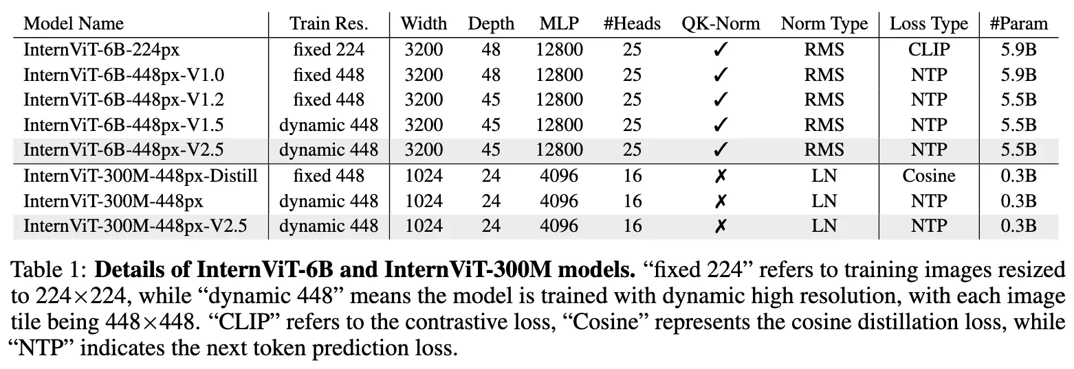 视觉编码器部分:还是和以前一样,分为两个尺寸,InternViT-6B 和 InternViT-300M,具体的细节如下,对于 6B 的模型,加了 QK-Norm 和 RMSNorm,V1.0 和 V1.2 的版本是在固定分辨率 448px 下训练的,而 V1.5 和 V2.0 则是动态分辨率,并且在 V1.5 版本,将 48 层的最后三层删掉了,保留了 45 层,用 NTP 训练的增强特征提取能力。对于 300M 的模型,从 CLIP-ViT-Large-336px 中初始化得到,并且少了 QK-Norm 和 RMSNorm,然后蒸馏 6B 模型,蒸馏结束之后用 NTP loss 进行训练。在本文引入了 v2.5 的模型版本 InternViT-300M-448px-V2.5