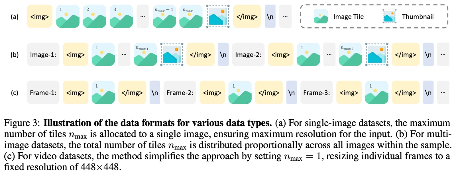 不同数据类型的数据格式。(a) 对于单图像数据集,分配给单个图像的最大块数 nmax,以确保输入的最大分辨率。(b) 对于多图像数据集,总块数 nmax 在样本中的所有图像之间按比例分配。© 对于视频数据集,该方法通过设置 nmax = 1 来简化方法,将单个帧调整为固定分辨率 448×448。下面图展示了这一点